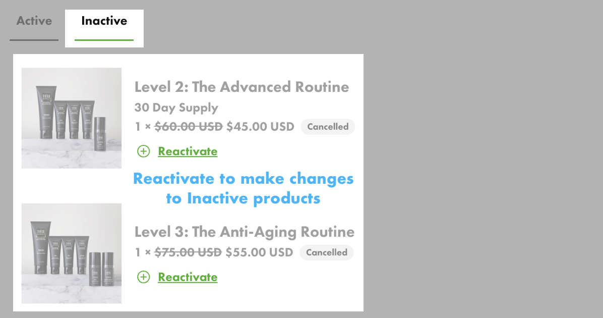 Inactive subscriptions show as cancelled and will not re-order until reactivated.