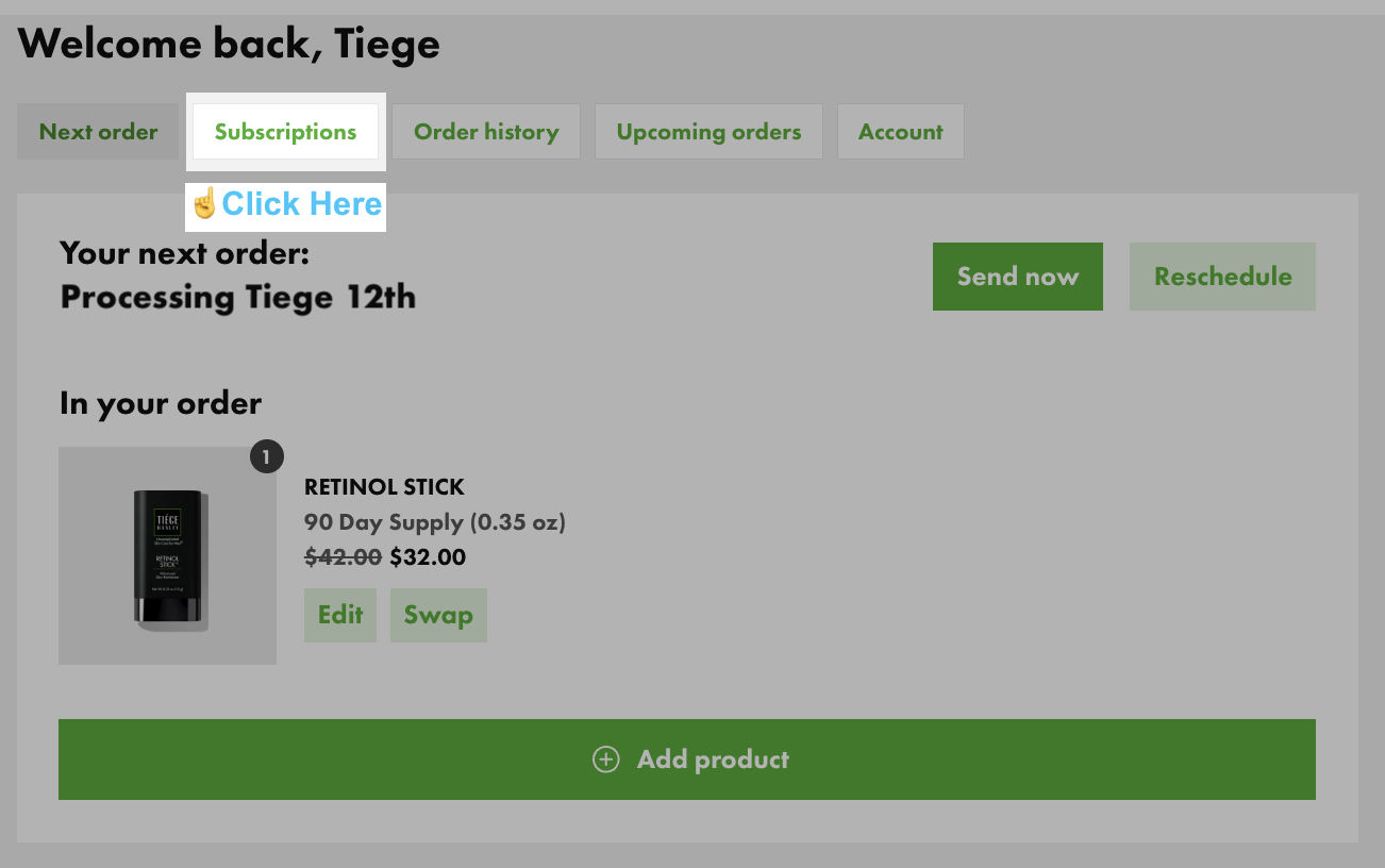 Active subscriptions have an order frequency showing how often they will re-order.