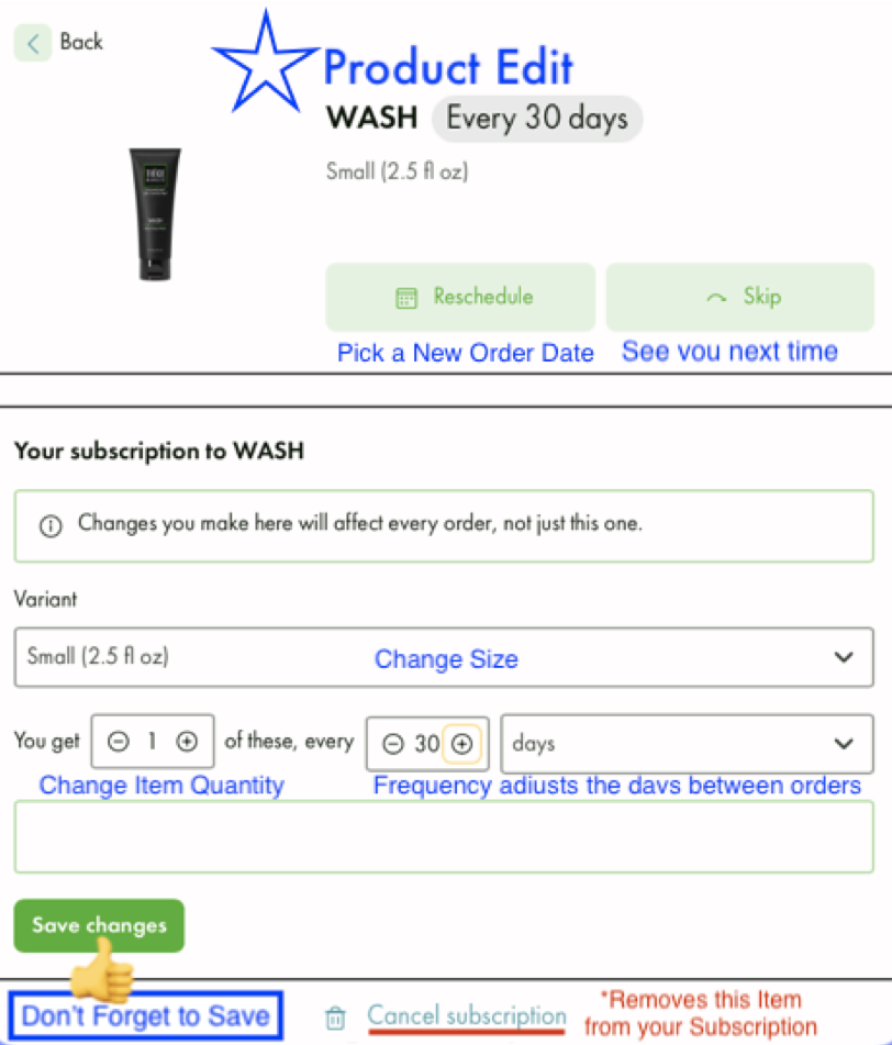 - Frequency sets the days between orders. Reschedule after changing frequency.